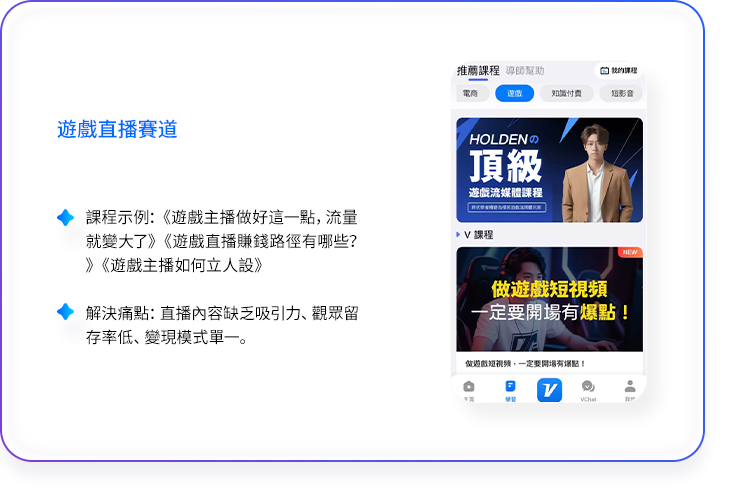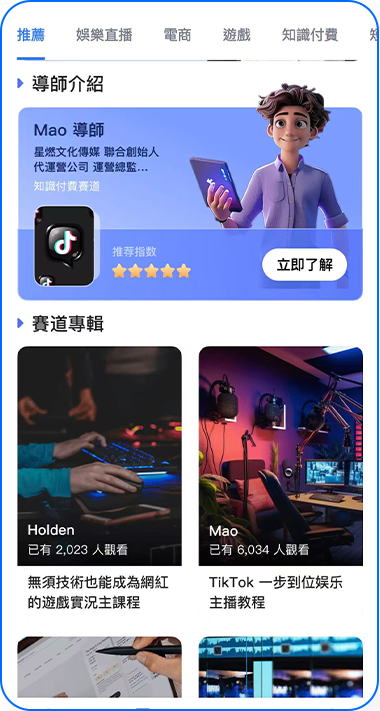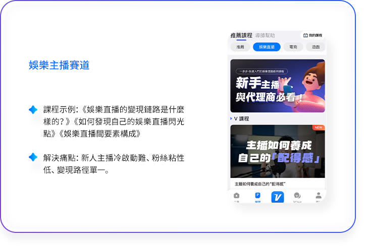 彙聚海量行業寶戰課程與頂尖導師資源,覆蓋娱樂直播、電商、短影音、遊戲直播、知識付費等熟門赛道,助您快速掌握核心技能,搶佑市場先機。